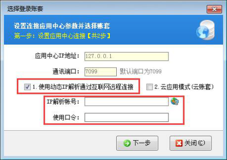 客戶端電腦登錄界面“選擇賬套”—》“使用動態IP解析通過互聯網遠程連接”,輸入IP解析賬號和使用口令,點擊“下一步”,選擇賬套,選擇操作員并填寫密碼,進入軟件首頁。