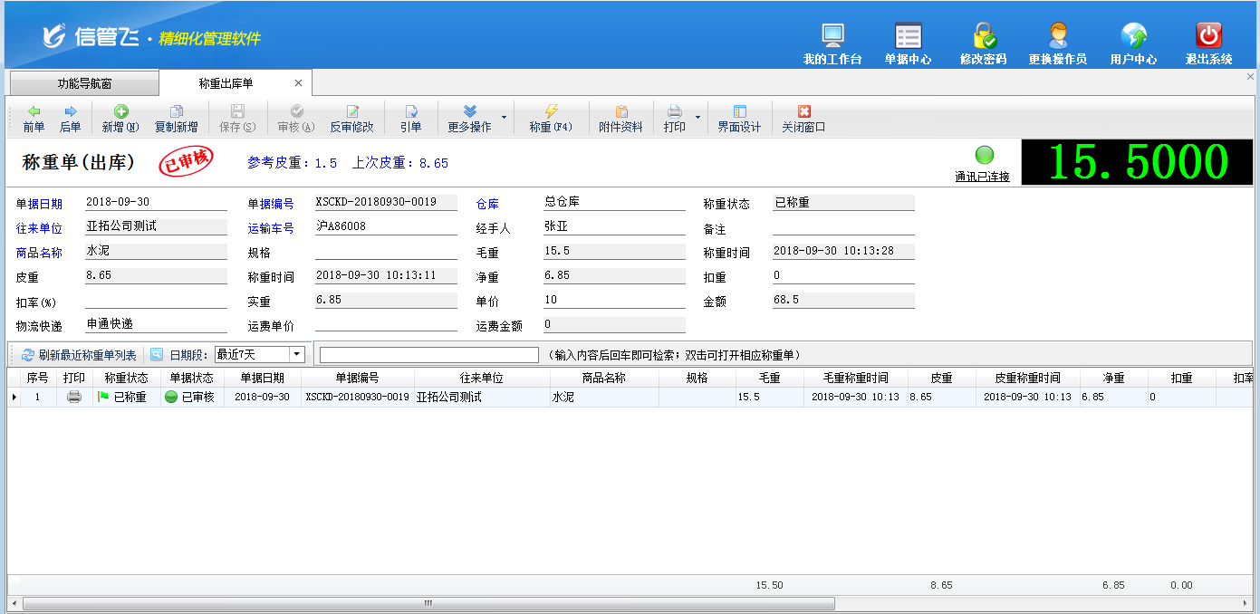 功能描述:可以連接稱重設備自動讀取稱重數據,軟件內支持“稱重兩次”、“稱重一次自動去皮重”、“稱重一次不要皮重”三種方式,可以自由設置稱重方式,對稱重的單據數據進行記憶。有效管理稱重數據,提高工作效率。已開的單據記錄軟件中支持查詢。