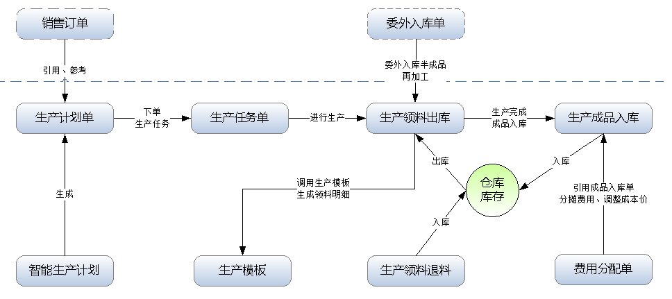 包括功能:生產模板、生產計劃單、生產任務單、生產領料出庫單、生產成品入庫單、生產退料入庫單及智能生產計劃等。