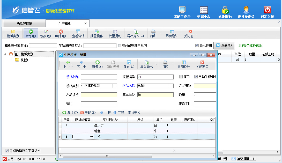 生產模板,即BOM清單(物料清單),可配置每生產一個標準單位的產品產品需要的原材料種類和數量。