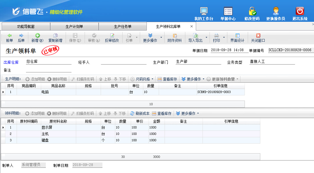 生產領料單,用于原材料的出庫。生產領料單包括生產產品明細和領料明細,可根據“生產模板”自動生成需要的原材料明細。