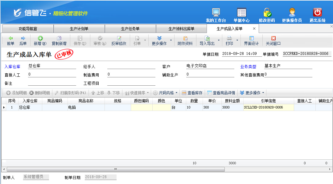 生產成品入庫單,用于生產成品(包括生產成品及生產半成品)的入庫。