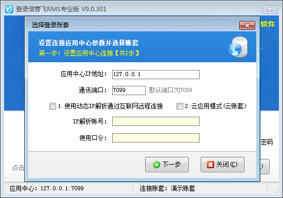 (2)互聯網遠程使用:如果是通過互聯網遠程連接(比如異地使用),軟件支持動態IP解析服務和云應用(云賬套)兩種方式(均為增值服務,需按年付費)。購買后輸入我們提供的IP解析帳號、使用口令或通行證帳號、密碼,然后點“下一步”按鈕,選擇要登錄的賬套。