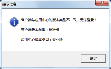 ????(3)如果登錄的時候提示如下信息,則表明客戶端程序的版本類型與主機電腦上的應用中心程序的版本類型不一致,請使用相同版本類型的程序登錄即可。