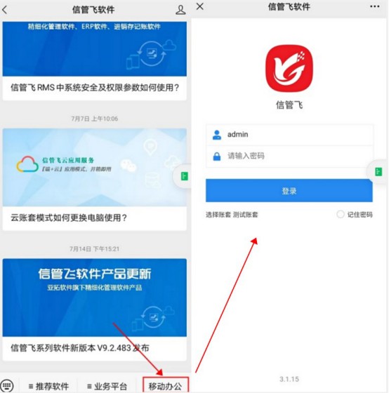 ????移動端是在手機微信上登錄的,使用微信端服務需要微信先關注信管飛微信公眾號“信管飛軟件”,在微信公眾號界面選擇“移動辦公”進入。具體如何使用可參考以下操作步驟。