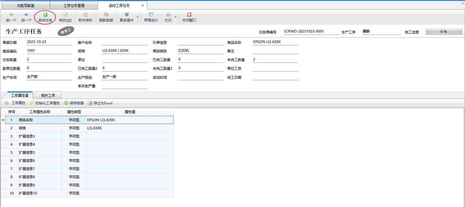 啟動任務:點擊“啟動任務”可以打開啟動工序任務界面,點擊啟動任務,單據狀態更新為正在執行。