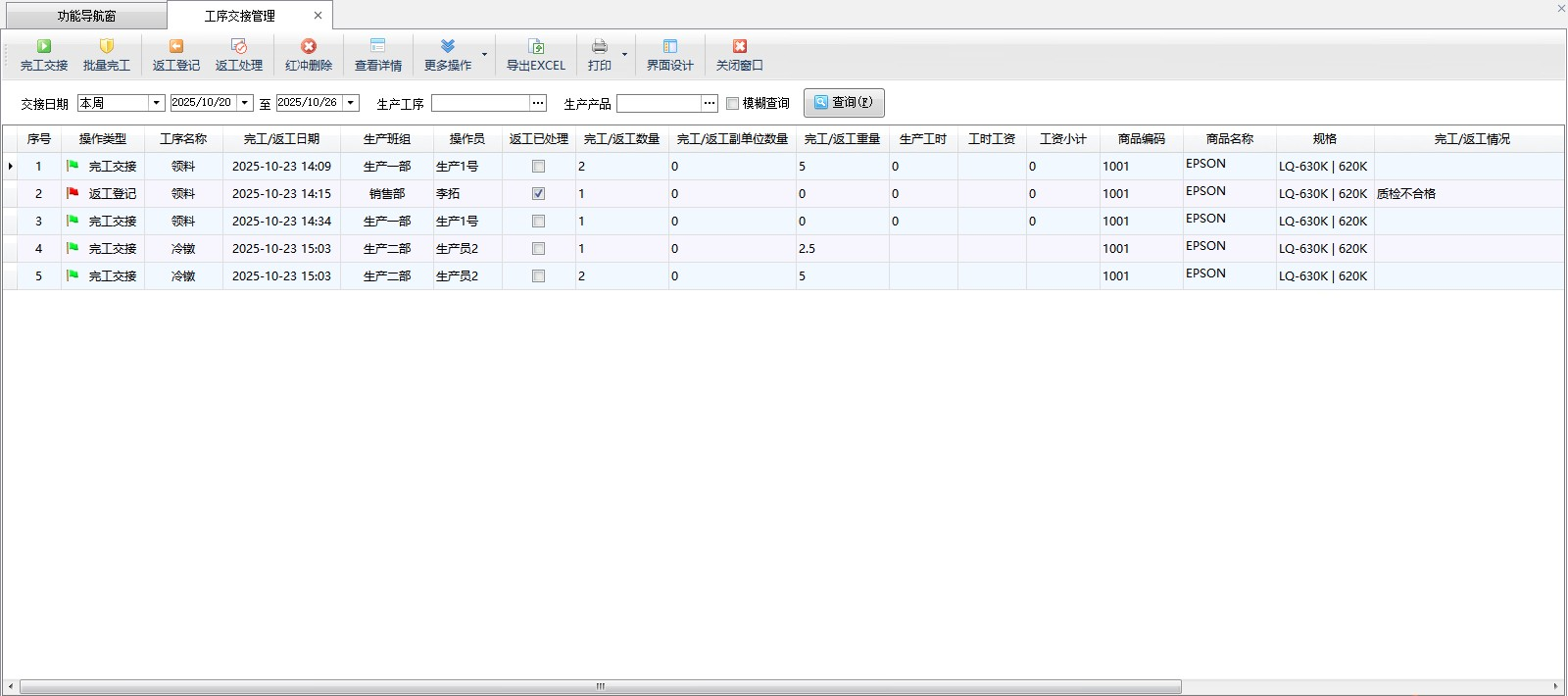 生產工序交接明細:可統計某個時間段內,每道工序的生產工時、工時工資、工資小計、完工情況以及返工情況。