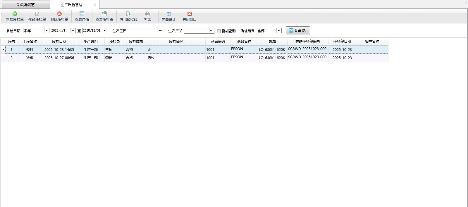 生產質檢明細查詢:可根據生產工序、質檢日期、生產產品、質檢結果等條件查詢某個時間段內,生產質檢明細信息。