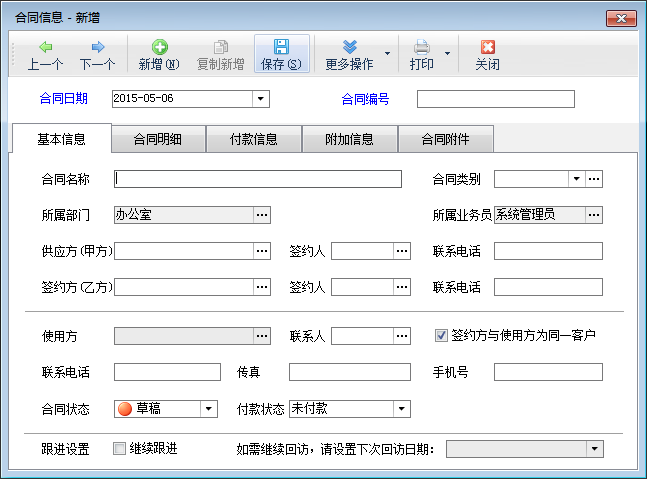 新增合同:點工具欄中的“新增合同”按鈕,可以增加合同記錄。