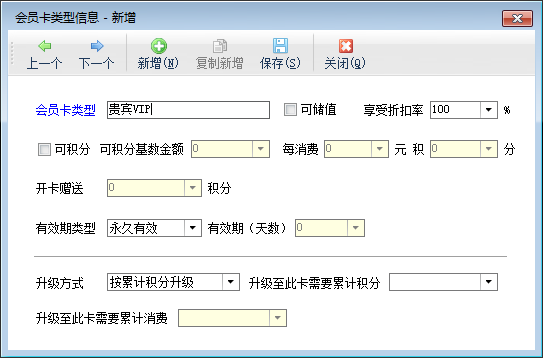 新增會員卡類型:在工具欄中點擊“新增”按鈕可以增加會員卡類型。