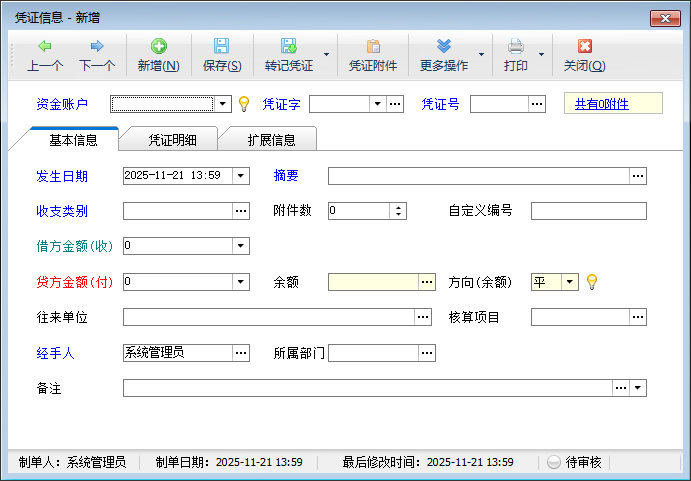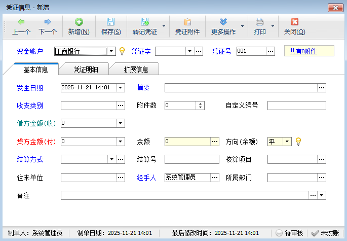 ????在新增或修改憑證時,系統支持“轉記憑證”功能,用于處理存款、取款、轉帳等涉及多個帳戶的憑證錄入,方便用戶操作,減少重復錄入。