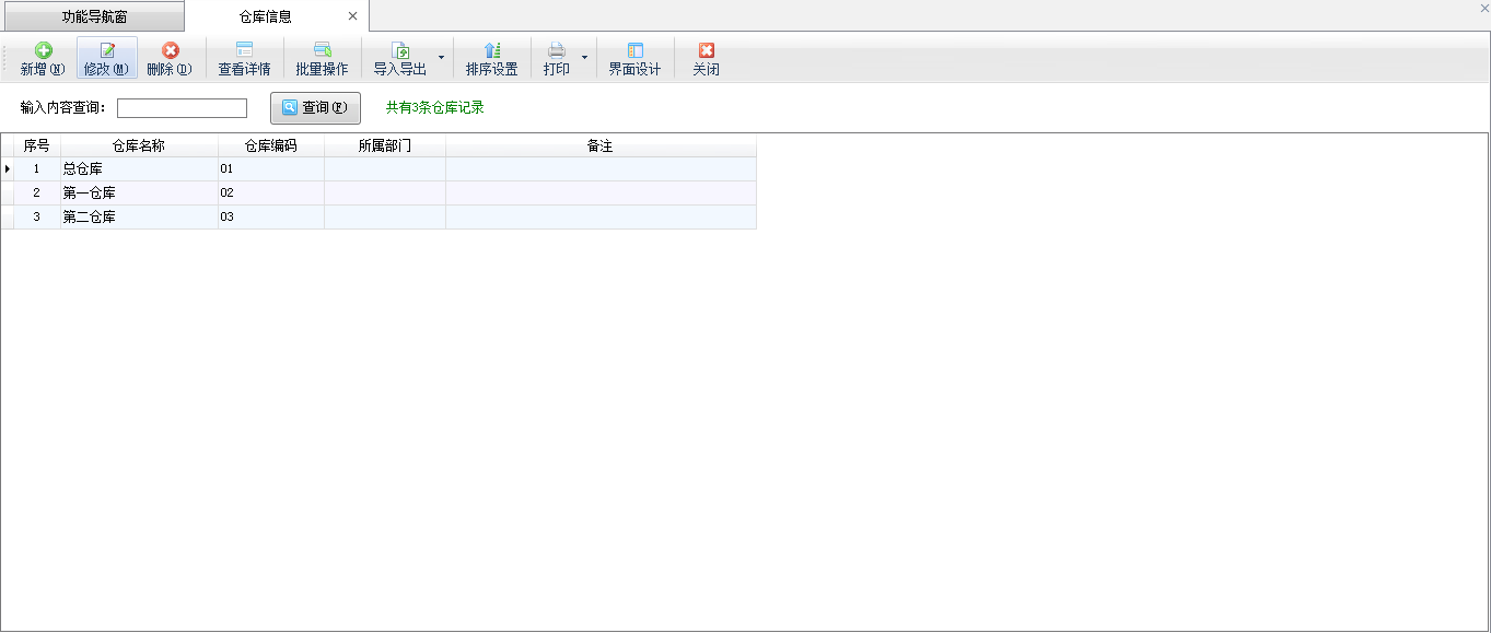 ????點(diǎn)“基礎(chǔ)資料”—》“倉庫信息”可以進(jìn)入倉庫信息管理功能。點(diǎn)“新增”按鈕可以增加新倉庫,點(diǎn)“修改”按鈕可以修改倉庫信息,點(diǎn)“刪除”按鈕可以刪除倉庫。點(diǎn)“排序設(shè)置”按鈕可以對倉庫進(jìn)行排序,后續(xù)在選擇倉庫和倉庫查詢中可以按照排序進(jìn)行顯示。