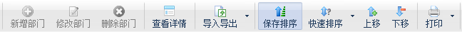 ????點(diǎn)“設(shè)置排序”按鈕,可以進(jìn)入排序模式,軟件會顯示幾個排序按鈕,可以點(diǎn)“快速排序”排序按照部門名稱或編碼進(jìn)行自動排序,或者手工點(diǎn)“上移”、“下移”按鈕設(shè)置排序。設(shè)置完成后,點(diǎn)“保存排序”即可保存排序設(shè)置。