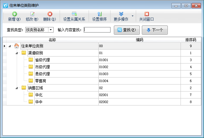 ????軟件支持無限層級的往來單位類別,并支持自動生成類別編碼,方便后續(xù)查詢和統(tǒng)計(jì)。點(diǎn)“設(shè)置從屬關(guān)系”進(jìn)入拖動調(diào)整從屬關(guān)系模式,可以拖動改變類別的從屬關(guān)系。點(diǎn)“設(shè)置排序”可以調(diào)整類別的排序。