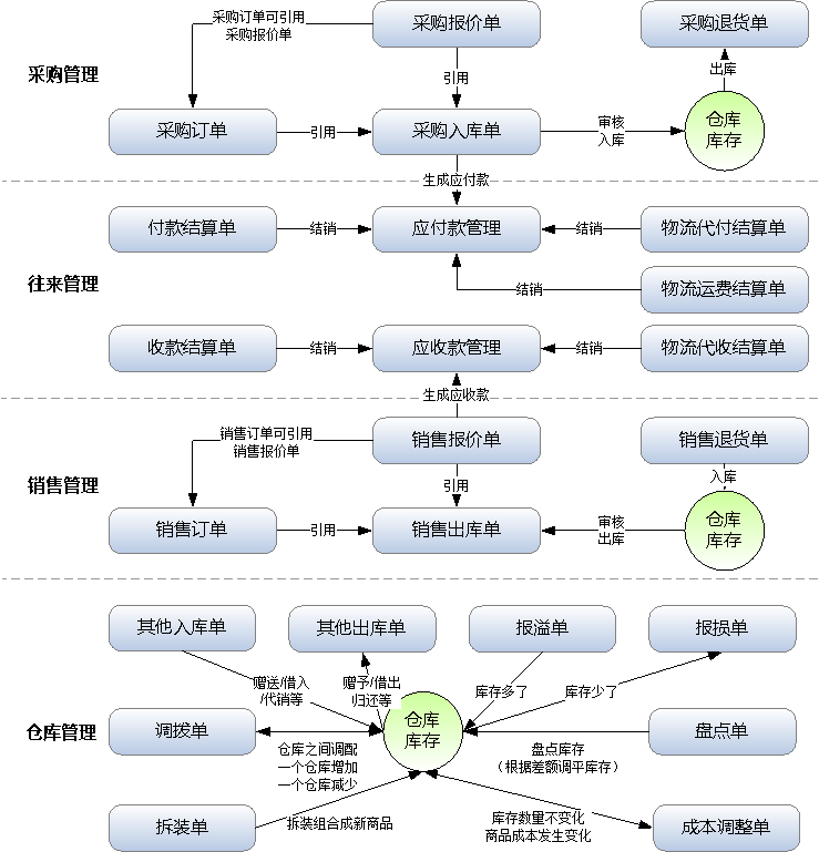 ????信管飛RMS為進(jìn)銷存、財(cái)務(wù)一體化管理軟件,業(yè)務(wù)覆蓋企業(yè)經(jīng)營管理的方方面面,下圖為進(jìn)銷存(采購管理、銷售管理、倉庫管理、往來管理)的基本流程圖: