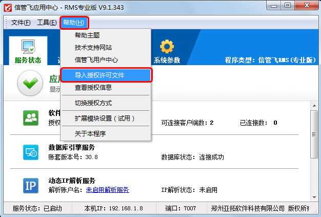 ????在軟件升級(jí)(如單機(jī)版升級(jí)為網(wǎng)絡(luò)版,網(wǎng)絡(luò)版增加用戶(hù)數(shù)時(shí)),點(diǎn)菜單“幫助”—》“導(dǎo)入授權(quán)文件”,輸入授權(quán)序列號(hào),然后點(diǎn)“獲取授權(quán)”按鈕可以從信管飛云應(yīng)用中心獲取最新的授權(quán)許可。獲取授權(quán)許可信息后,請(qǐng)重啟信管飛應(yīng)用中心程序即可。