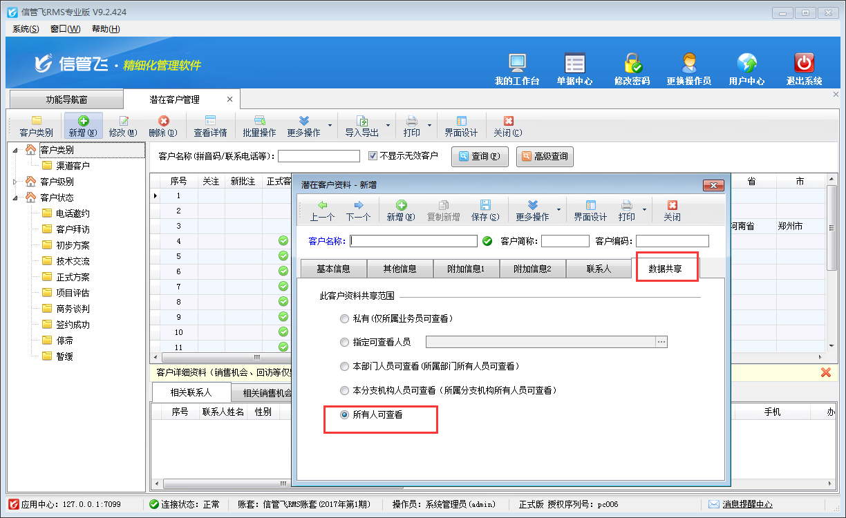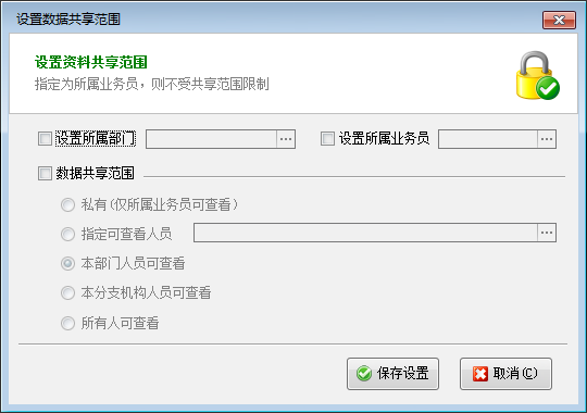 ????共享范圍設置為“私有”,則只有該潛在客戶資料的“所屬業務員”才可以查看,除錄入人和所屬業務員外,其他人無法查看到此潛在客戶信息。如果沒有指定所屬業務員,則只有錄入人可以看到。