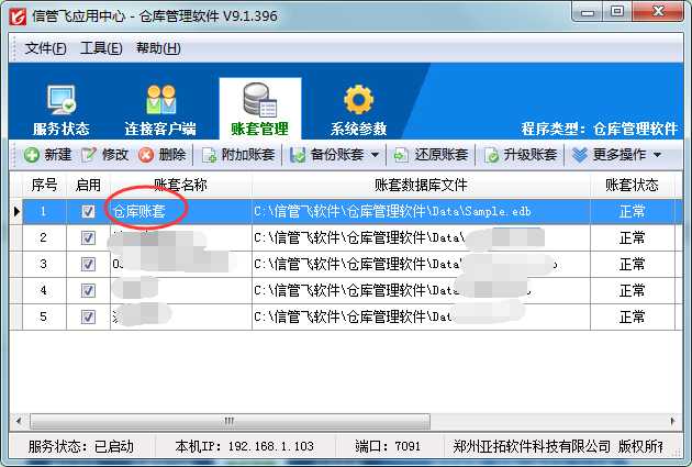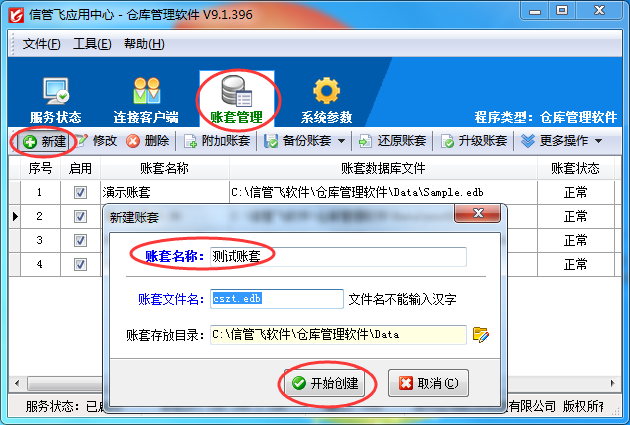 ????賬套即賬套數據庫,這是一個會計業務引申出來的概念,賬套數據庫中存儲業務數據。使用軟件之前建議新增加一個賬套,用于重新錄入和管理數據,信管飛RMS、信管飛倉庫管理軟件、信管飛送貨單軟件、信管飛出納記賬軟件、信管飛票據打印軟件等軟件的賬套都是在主機電腦的應用中心程序上集中管理的,下面我們以信管飛倉庫管理軟件為例詳細介紹下在使用軟件之前如何新增加一個賬套?