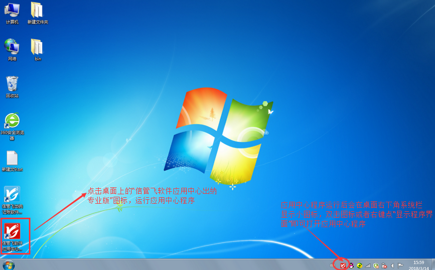 ????運行信管飛出納記賬軟件應用中心并打開信管飛出納記賬軟件應用中心程序界面,主機電腦上軟件安裝后會在桌面上自動創建“信管飛出納記賬軟件應用中心(紅色圖標)”及“信管飛出納記賬軟件即客戶端(藍色圖標)”的快捷方式,點擊“信管飛出納記賬軟件應用中心(紅色圖標)”即可運行信管飛出納記賬軟件應用中心,如下圖所示。