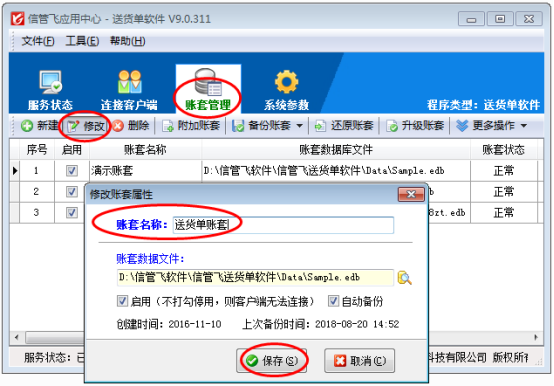 ????以“信管飛送貨單軟件”為例,示范下如何修改賬套的名稱。打開紅色的應用中心程序(應用中心運行后桌面右下角會顯示相應的圖標,點擊即可打開應用中心主界面),在賬套管理界面,點擊賬套后選擇工具欄中的“修改”按鈕,彈出“修改賬套屬性”界面,把“演示賬套”修改為“送貨單賬套”,然后點擊“保存”按鈕,如下圖所示: