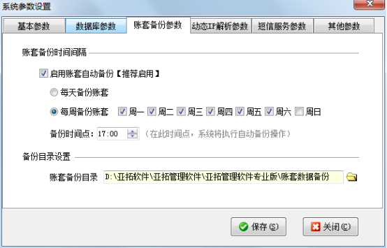 ????另外在“系統參數”——“賬套備份參數”中可以設置是否啟用自動備份、備份時間間隔和備份目錄。我們強烈建議啟用自動備份,以便賬套出現問題的時候從賬套備份文件中恢復數據。