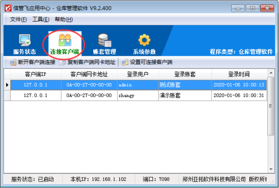 ????信管飛RMS、信管飛倉庫管理軟件、信管飛出納記賬軟件、信管飛送貨單軟件、信管飛票據打印軟件都包括客戶端程序和應用中心程序兩個模塊,客戶端程序登錄系統時,應用中心程序是必須打開的。如果主機電腦(網絡版用戶插入加密鎖的電腦為主機電腦)關機或關閉應用中心程序、程序出現異常等,客戶端程序與應用中心的連接就會斷開。應用中心程序再次正常運行后,客戶端程序需要重新建立與應用中心程序的連接。下面我們以信管飛RMS專業版為例介紹一下客戶端程序重連應用中心程序的操作。
