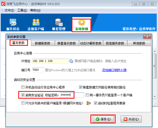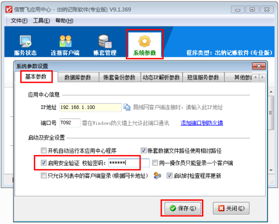 ????應用中心打開后會在電腦的右下角顯示,打開紅色圖標的應用中心,點擊“系統參數”會彈出各參數的設置界面,選擇“基本參數”在啟動與安全設置下勾選上“開機自動運行本應用中心程序”保存,則下次開機后會自動運行應用中心,操作如下圖所示:
