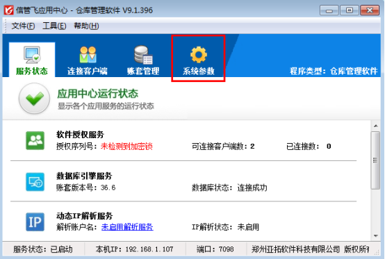 ????信管飛RMS、信管飛倉庫管理軟件、信管飛出納記賬軟件、信管飛送貨單軟件和信管飛票據打印軟件都由客戶端程序和應用中心程序兩部分組成,應用中心可以全面掌控軟件的運行情況,可以隨時查看各類服務的運行狀態,主要包括軟件授權服務情況、數據庫引擎服務情況、動態IP解析服務情況、手機短信服務情況等。下面我們以信管飛RMS專業版為例介紹一下應用中心的服務狀態。