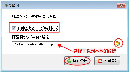 ????在賬套備份界面。勾選“下載賬套備份文件到本地”,選擇下存儲路徑,文章以存在“電腦桌面”為例,然后點擊“執行備份”操作,會把備份文件下載到本地桌面上,如下圖所示:
