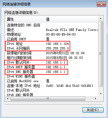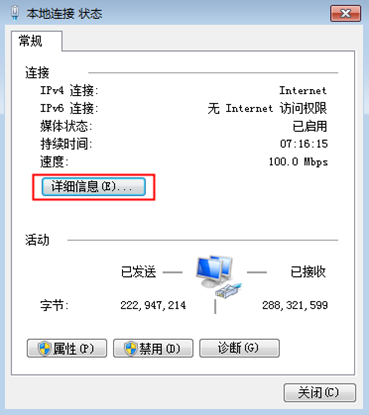 ????②本地連接狀態如圖所示,點擊“詳細信息”按鈕,會出現如圖所示的網絡連接詳細信息,此時需要記一下“IPv4地址”、“IPv4子網掩碼”、“IPv4默認網關”和“IPv4 DNS服務器”的信息,后面固定IP地址時需要用到。
