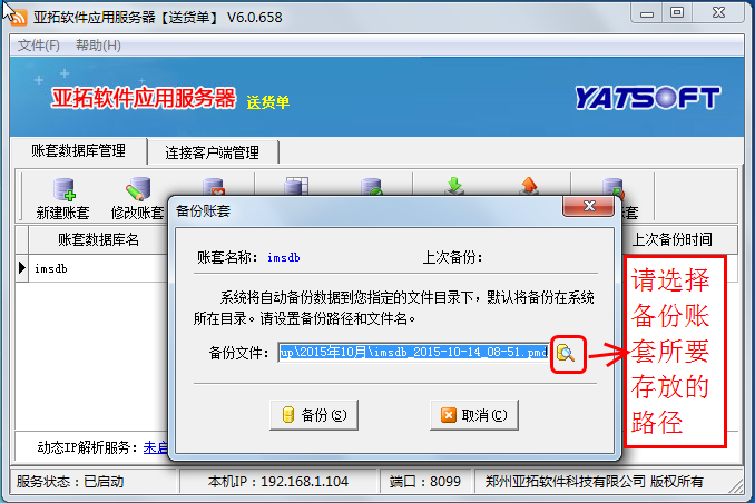 ????先在原主機上登錄軟件檢查下數據,確認沒問題后,打開亞拓軟件應用服務器,在亞拓軟件應用服務器上選中賬套,點擊“備份賬套”執行備份賬套操作,點擊備份賬套后,會彈出“備份賬套”窗口,可以選擇備份文件所存放的路徑(一般情況下默認存放在軟件的安裝目錄下DBBackup文件夾下),然后將剛才備份的賬套數據文件通過U盤或者移動硬盤等方式拷貝到新主機電腦上。