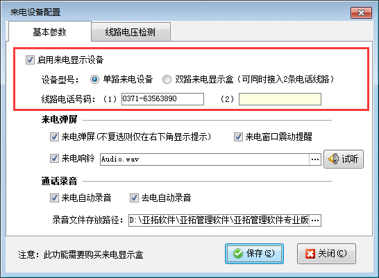 ????來電設備配置:使用來電彈屏功能首先需要外接設備來電顯示盒,來電顯示盒連接配置好之后需要在軟件內啟用來電顯示設備并設置線路電話號碼,來電顯示配置如下圖所示: