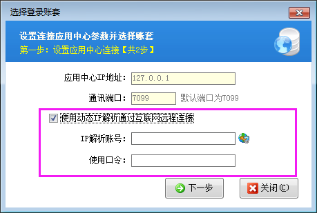 ????打開客戶端登錄界面的“選擇賬套”按鈕,然后勾選“啟用動態IP解析”,填寫IP解析用戶名和密碼,點擊“下一步”,進入選擇賬套的界面,選擇賬套后回到登錄界面,選擇操作員并輸入密碼,進入軟件首頁。