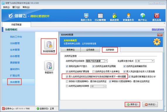 ????在功能導航窗點擊“系統管理”—》“系統參數配置”,在“出納參數”界面勾選“錄入出納憑證時發生日期的年份與系統日期的年度不一樣時提醒”參數,然后點擊“保存”按鈕保存參數配置。