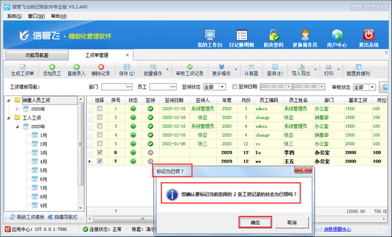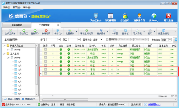 ????信管飛出納記賬軟件專業(yè)版包括工資管理功能,支持自定義工資模板,可根據(jù)設(shè)置的工資模板快速生成工資單,支持從上月工資單復(fù)制工資項(xiàng)目數(shù)據(jù),工資項(xiàng)目數(shù)據(jù)錄入完成核對(duì)無(wú)誤后審核生效,審核后不再支持直接修改。如果工資記錄較多,逐條審核工資記錄會(huì)比較耗時(shí),軟件支持批量審核工資記錄,可節(jié)省時(shí)間提高工作效率。本篇文章介紹一下出納記賬軟件中如何批量審核工資記錄?