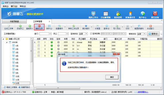 ????信管飛出納記賬軟件專業(yè)版包括工資管理功能,支持自定義工資模板,可根據(jù)設(shè)置的工資模板快速生成工資單,支持從上月工資單復(fù)制工資項(xiàng)目數(shù)據(jù),工資記錄審核后,無(wú)法直接刪除,如下圖所示,如確定需要?jiǎng)h除,需要反審到未審核狀態(tài),然后在執(zhí)行刪除操作,本文介紹一下出納記賬軟件中如何刪除已審核的工資記錄?