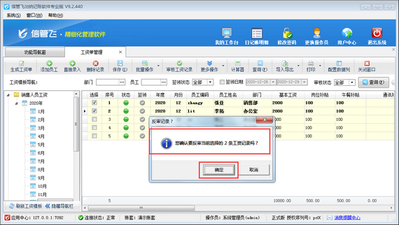 ????在功能導(dǎo)航窗點(diǎn)擊“綜合管理”—》“工資單管理”,打開(kāi)工資單管理界面,在工資記錄列表中打鉤選擇要反審的工資記錄,然后點(diǎn)擊“更多操作”—》“反審工資記錄”,系統(tǒng)彈出提示信息“您確定要反審當(dāng)前選擇的工資記錄嗎”,如下圖所示,點(diǎn)擊“確定”按鈕確定反審工資記錄。