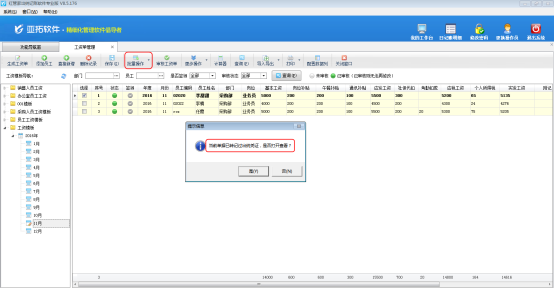 ????在功能導(dǎo)航窗點(diǎn)擊“綜合管理”—》“工資單管理”,打開(kāi)工資單管理界面,在工資記錄列表中打鉤選擇要審核的工資記錄(工具欄點(diǎn)擊“批量操作”支持全選),然后點(diǎn)擊“審核工資記錄”,系統(tǒng)彈出提示信息“您確定要審核當(dāng)前選擇的工資記錄嗎”,如下圖所示,點(diǎn)擊“確定”按鈕確定批量審核工資記錄。