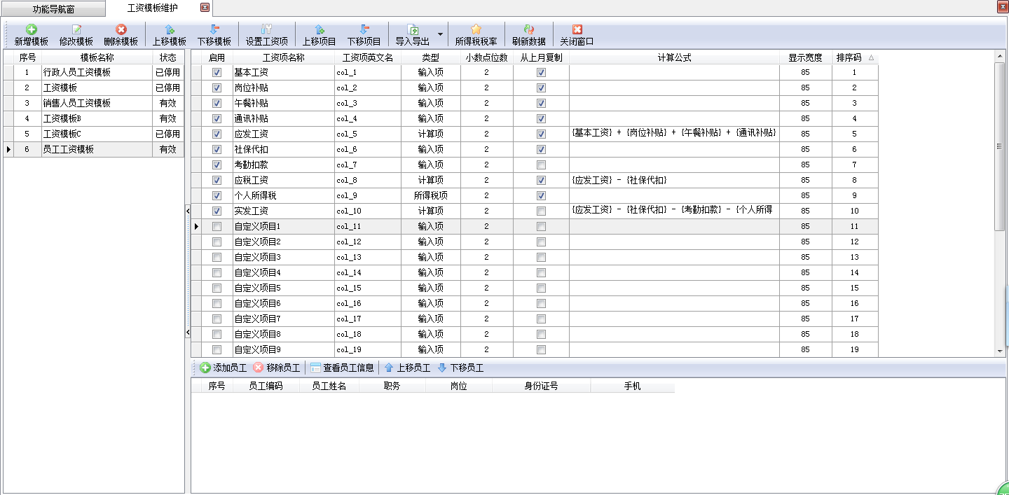 ????上移模板、下移模板:在工具欄點(diǎn)擊“上移模板”、“下移模板”可以調(diào)整工資模板的顯示順序。