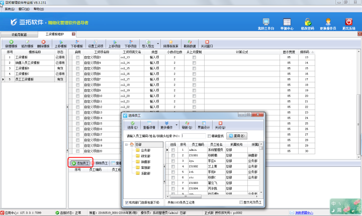 ????添加員工:工資模板設(shè)置好之后,可以添加需要按照此工資模板來(lái)計(jì)算工資的相應(yīng)人員。