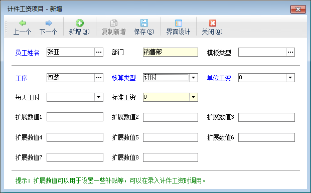 ????增加項(xiàng)目:點(diǎn)擊工具欄中的“增加項(xiàng)目”按鈕,可以打開(kāi)“新增計(jì)件工資項(xiàng)目”窗口,核算類型分為“計(jì)件”或“計(jì)時(shí)”,用戶根據(jù)核算類型維護(hù)下每天工時(shí)、單位工資等相關(guān)數(shù)據(jù)項(xiàng)后點(diǎn)擊“保存”按鈕即可保存工資模板。