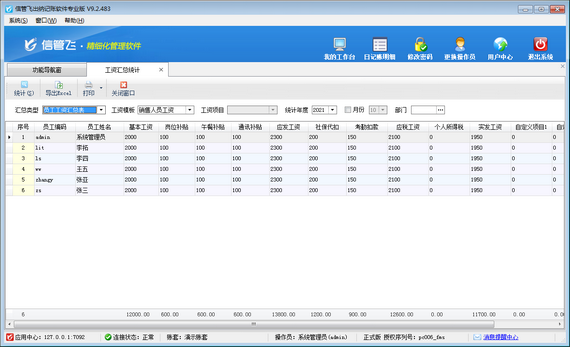 ????在功能導(dǎo)航窗點(diǎn)擊“綜合管理”—》“工資匯總統(tǒng)計(jì)”即可進(jìn)入工資匯總統(tǒng)計(jì)表界面,如下圖所示。