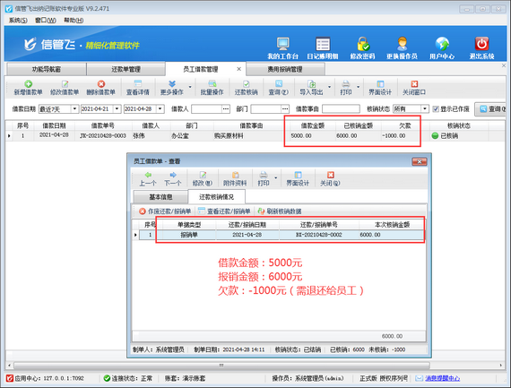 # 6.9.1 出納記賬軟件中報銷金額大于借款金額時,如何給員工找錢?