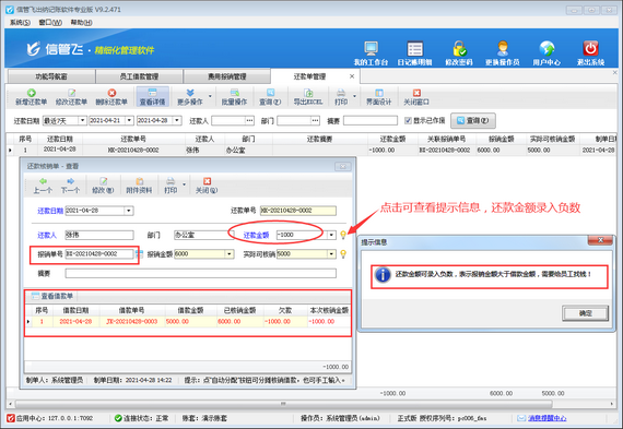 ????如下圖所示,員工“張偉”借款金額為5000元,費用報銷了6000元,報銷金額大于借款金額,導致欠款-1000元,需退還給員工。這種情況下,需做還款單,進行還款處理,將欠款金額清零。