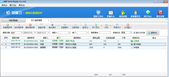 ????出納記賬軟件專業版的員工借款管理及還款管理功能可以對企業員工借款、還款進行流程化登記管理,提高了企業管理效率。員工借款匯總表可根據統計日期、借款人等條件來進行統計每個員工的借款及核銷情況,包括員工的此前欠款、本期借款、本期核銷金額及期末欠款等信息,本文詳細介紹一下如何查詢員工借款及核銷情況?