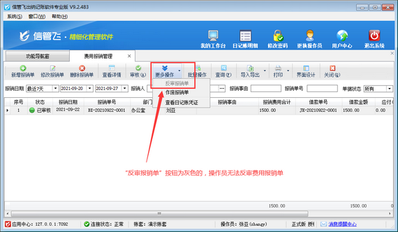 ????權限設置完成后,使用操作員“張亞”登錄軟件,打開費用報銷管理界面,在工具欄點擊“更多操作”,可以看到“反審報銷單”按鈕為灰色的,操作員無法反審費用報銷單。如下圖所示: