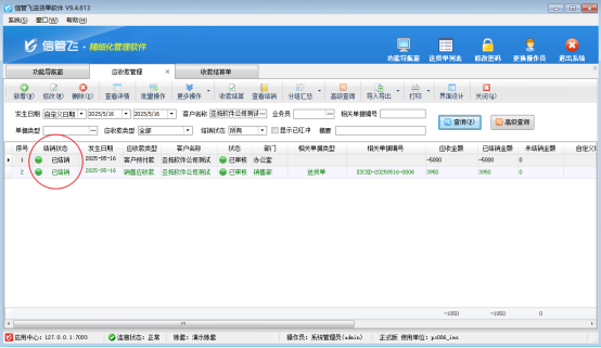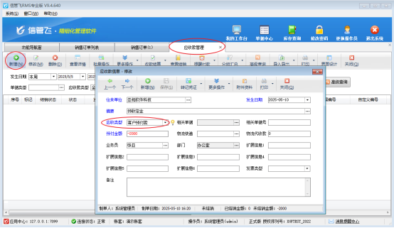 信管飛軟件支持登記客戶預付款,客戶預付款是客戶提前預付給我們的金額,可以用來沖銷銷售產生的應收款,預付款抵消應收款后多余部分需要退回給客戶,該如何處理? 如圖,客戶預付款是5000元,客戶送貨單消費是3950元,預付款抵消銷售單應收款多余1050元,多余金額需要退回給客戶。 在應收款管理界面點擊收款結算,進入收款結算單單據界面,在該界面錄入收款金額和收款賬戶,客戶預付款和銷售應收款抵消結算,多余預付退回,收款金額輸入負1050元,點擊自動分配,如圖&