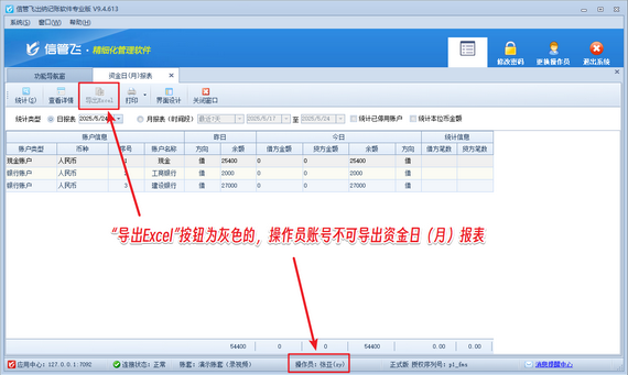信管飛出納記賬軟件內包含豐富的記賬統計報表,如現金賬簿、銀行賬簿、資金日(月)報表、收支類別匯總表等。如果不希望員工賬號導出這些報表,如何設置呢?本篇文章以信管飛出納記賬軟件為例演示一下出納記賬軟件內如何設置操作員不可導出資金日(月)報表? 演示視頻觀看鏈接:出納記賬軟件如何設置操作員不可導出資金日(月)報表演示視頻 登錄軟件,在功能導航窗點擊“系統管理”—》“操作員及授權”,進入“操作員管理及授權”界面,選擇操作員賬號“張亞”,在其右側的功能模塊權限內選擇“出納查詢”,將資金日(月)