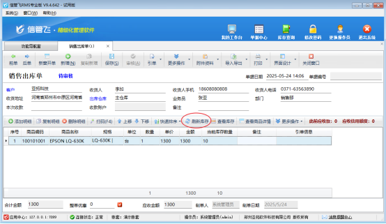 信管飛用戶在銷售出庫單界面中,選擇需要出庫的商品,并檢查其庫存數量是否已更新為最新值,可點擊刷新庫存操作,遇到出庫單界面沒有刷新庫存按鈕該如何處理? 在功能導航欄點擊“銷售管理”---銷售出庫單,打開銷售出庫單界面,在該界面點擊“界面設計”按鈕,在單據明細項勾選參數“當前庫存數量”,點擊保存按鈕,關閉銷售出庫單界面重新打開,即可刷新商品當前庫存。