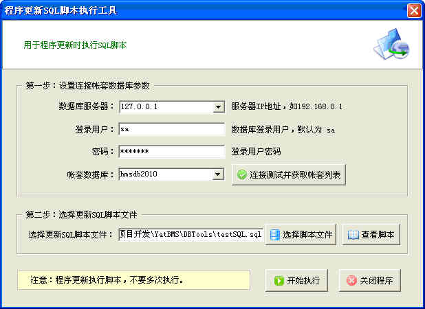 第一步:打開亞拓軟件系統管理工具 第二步、點擊“程序更新SQL腳本執行工具”,進入更新腳本窗口: 第三步、點擊“連接測試并獲取帳套列表”按鈕,然后從下拉列表框中選擇相應的帳套數據庫。 第四步、點擊“選擇腳本文件”按鈕,選擇要更新的腳本文件,如下圖所示: 第五步、點擊“開始執行”按鈕,執行腳本,執行完成后退出程序即可。